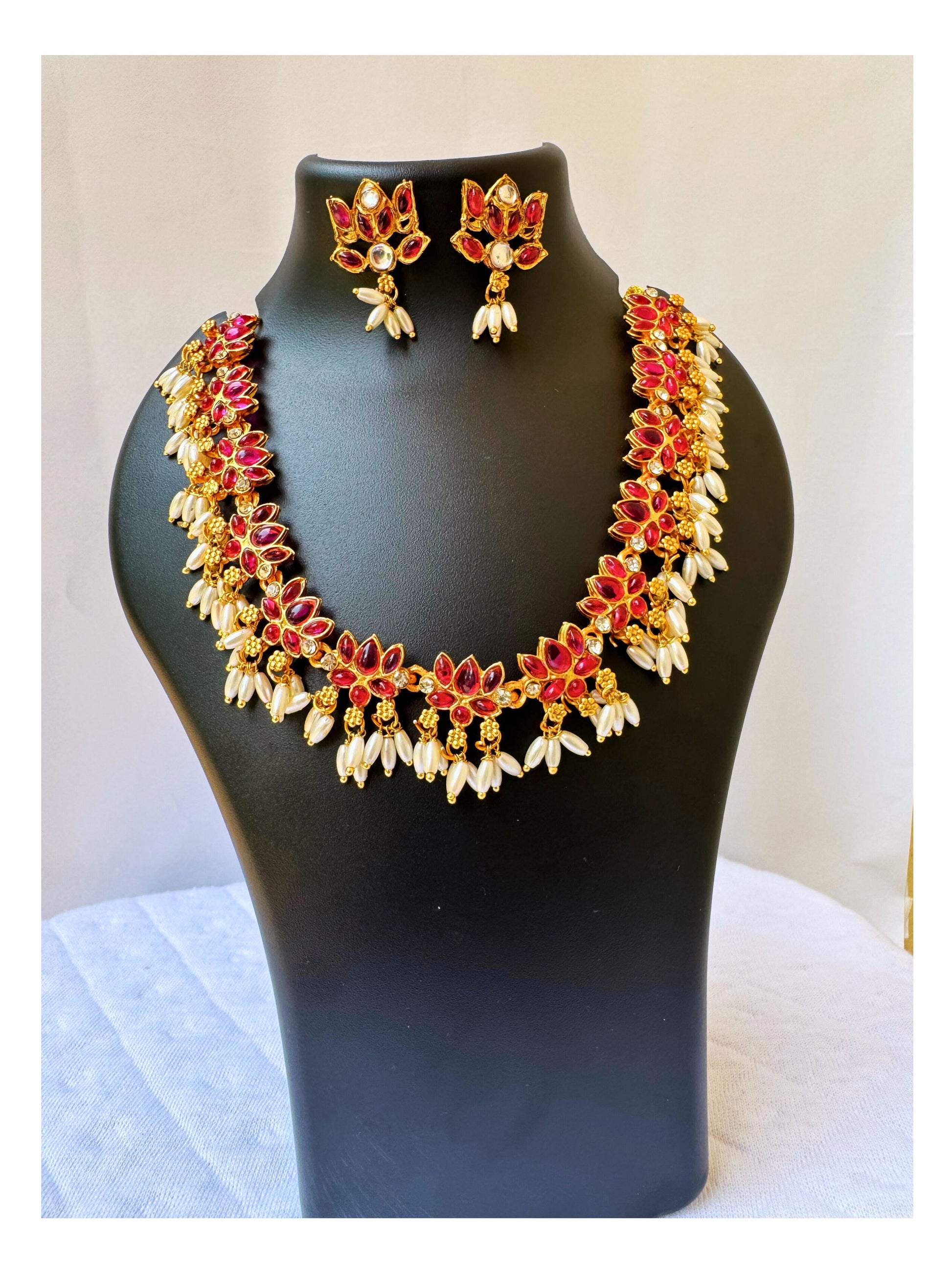 Make a bold statement with the Lotus Pearl Necklace, a stunning piece inspired by traditional temple jewelry. Featuring lustrous pearls arranged in a captivating lotus design, it adds a daring touch of elegance to any ensemble. Perfect for those who refuse to blend in, this necklace blends timeless craftsmanship with fearless style.