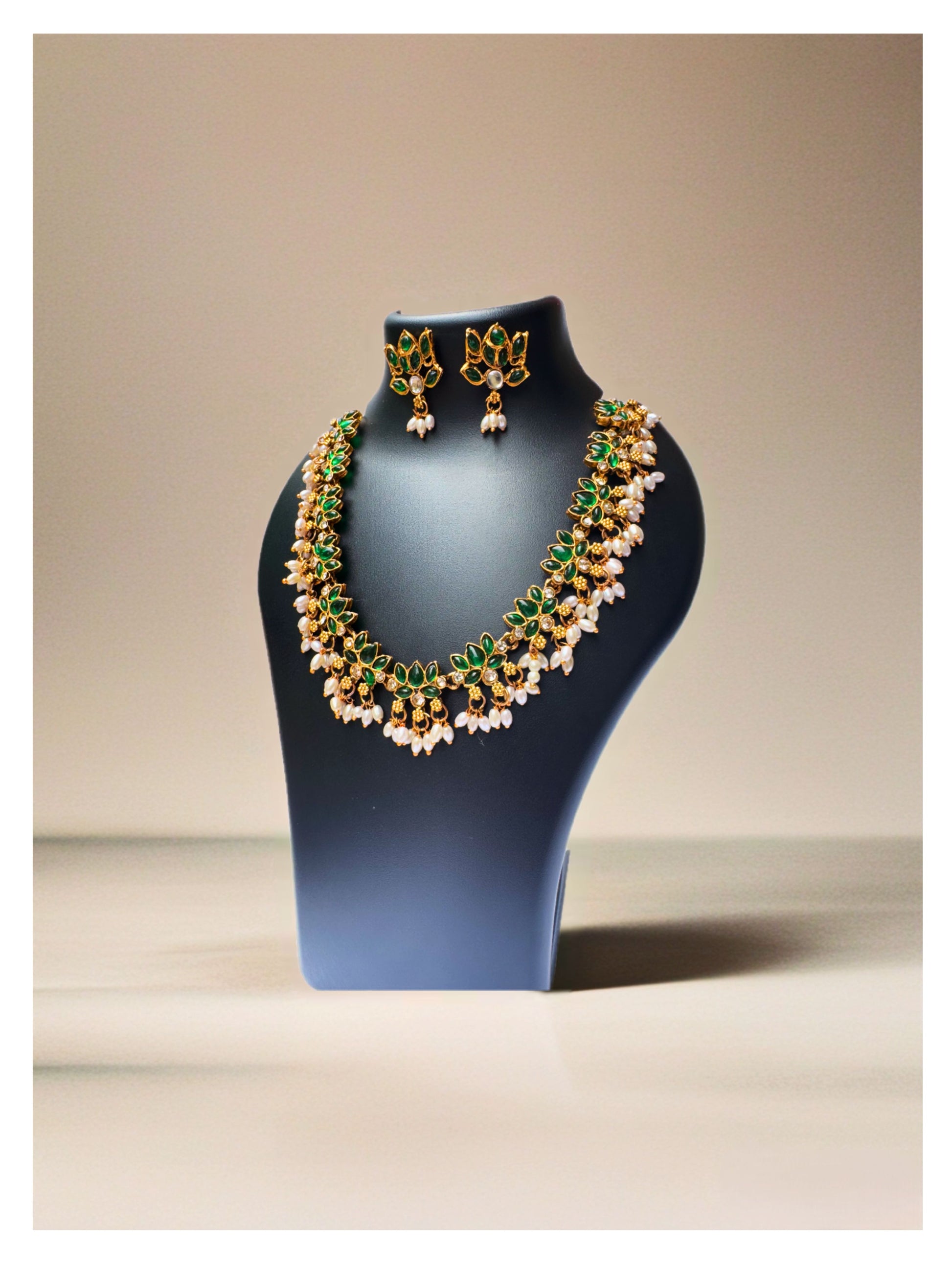 Make a striking impression with the Lotus Pearl Necklace, where classic temple jewelry meets bold design. Crafted with radiant pearls shaped into a mesmerizing lotus pattern, this piece commands attention and elevates your look with fearless elegance. Perfect for those who stand out, it fuses heritage artistry with a daring edge.